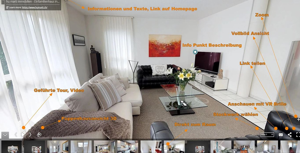 Nebst der selbstständigen Begehung können auch vordefinierte Touren abgespielt werden. So wird der Betrachter fast wie vom Makler durchs Haus geführt.